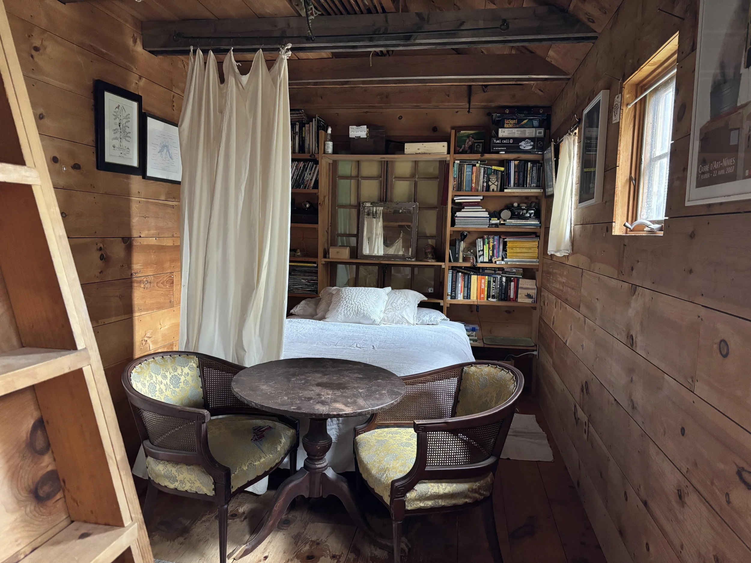 Peabody’s Chamber is on the top level of the Main House and is the bedroom of Mark Dion. It houses many artwork gifts from friends and family. Also, it is a repository of his infamous collection and signature uniform – plaid shirts.